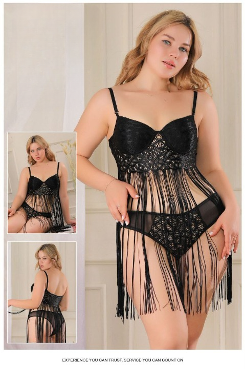 استمتعي بإطلالة أنثوية جريئة مع قميص النوم اللانجيري المزود بشراشيب جذابة تضيف حركة ناعمة ولمسة فريدة على كل خطوة.