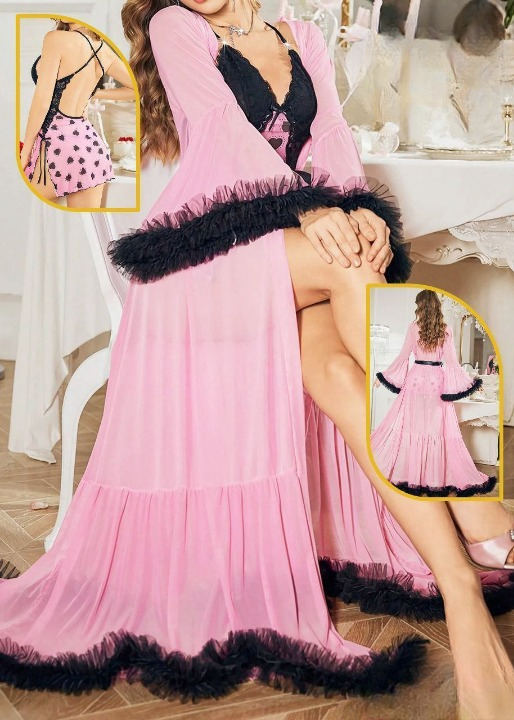 استمتعي بإطلالة أنثوية راقية مع هذا الطقم الفاخر المكون من قميص نوم قصير بتصميم قلوب رومانسية وتفاصيل دانتيل ناعمة على الصدر والجانبين، مع روب طويل من التل الخفيف يمنحك لمسة من الجمال والفخامة.