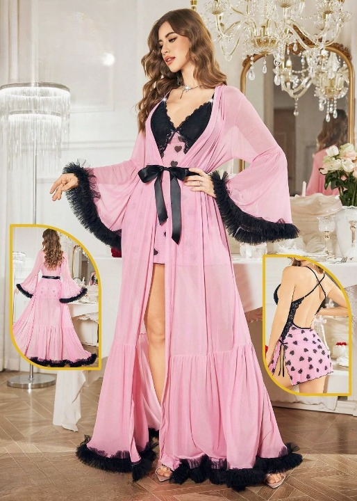 استمتعي بإطلالة أنثوية راقية مع هذا الطقم الفاخر المكون من قميص نوم قصير بتصميم قلوب رومانسية وتفاصيل دانتيل ناعمة على الصدر والجانبين، مع روب طويل من التل الخفيف يمنحك لمسة من الجمال والفخامة.