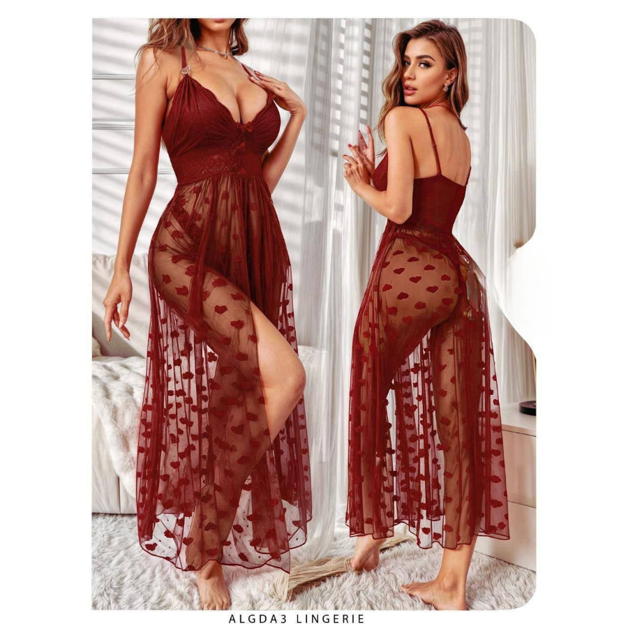 استمتعي بإطلالة راقية وجاذبية خاصة مع قميص النوم الطويل المصنوع من تل شفاف فاخر مزين برسمات قلوب أنثوية تضيف لمسة رومانسية وسحرية. تصميمه الأنيق يبرز جمال القوام ويجمع بين الرقة والفخامة، مع خامة خفيفة وناعمة تمنحك راحة مثالية وثقة متألقة. قميص نوم مثالي للسهرات الخاصة أو كهدية راقية تعكس ذوقك المميز.