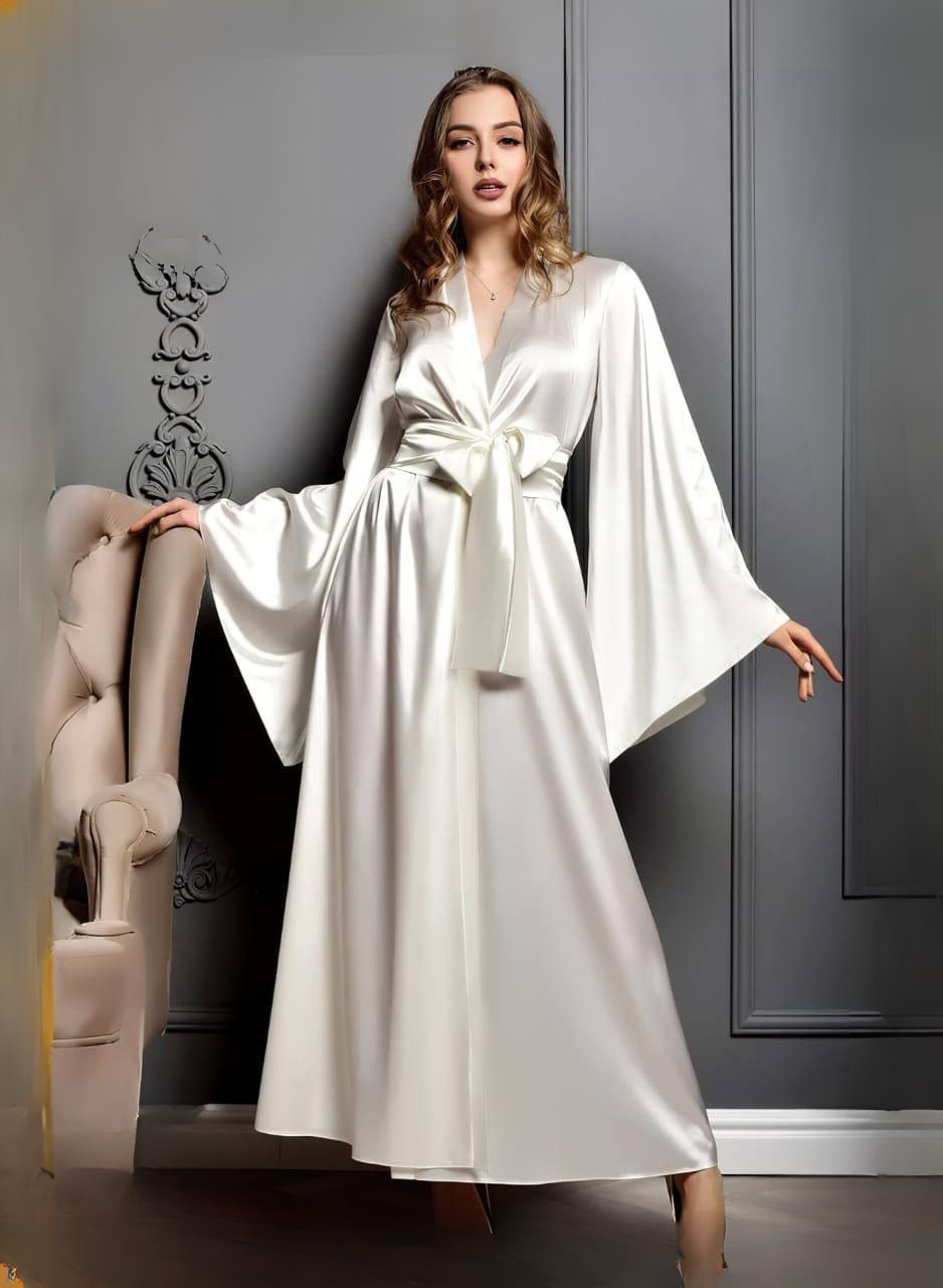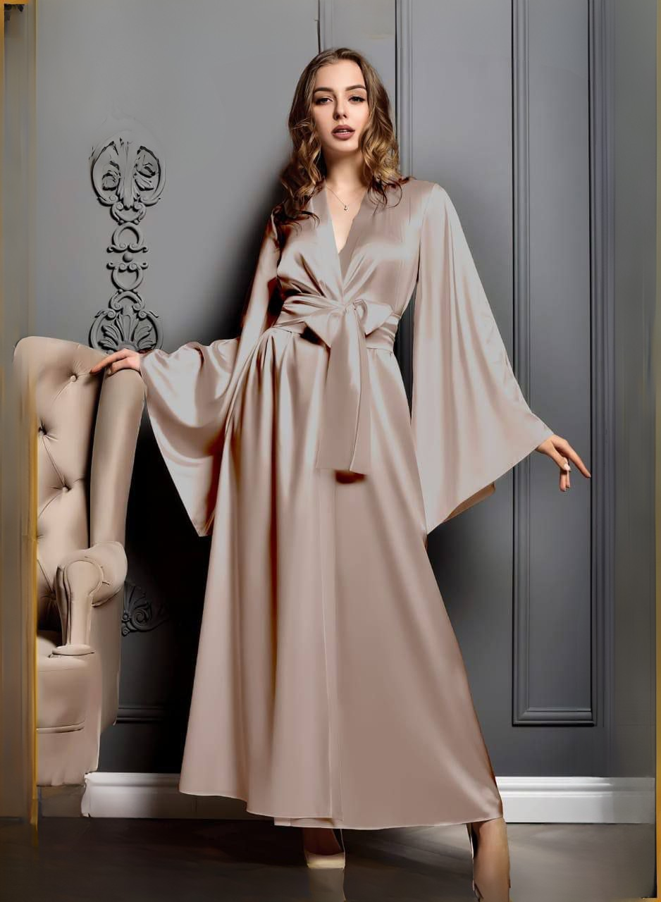الخامة: ستان ناعم | التصميم: أكمام واسعة بحزام خارجي